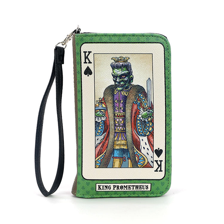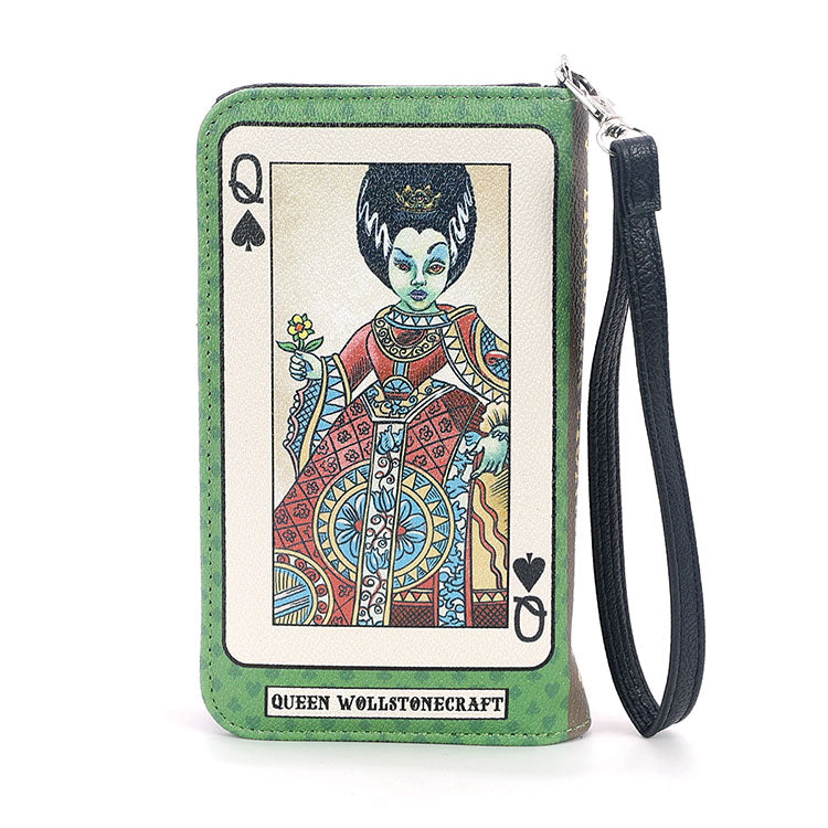 Button clasp closure. Includes a detachable 6" wristlet strap.
