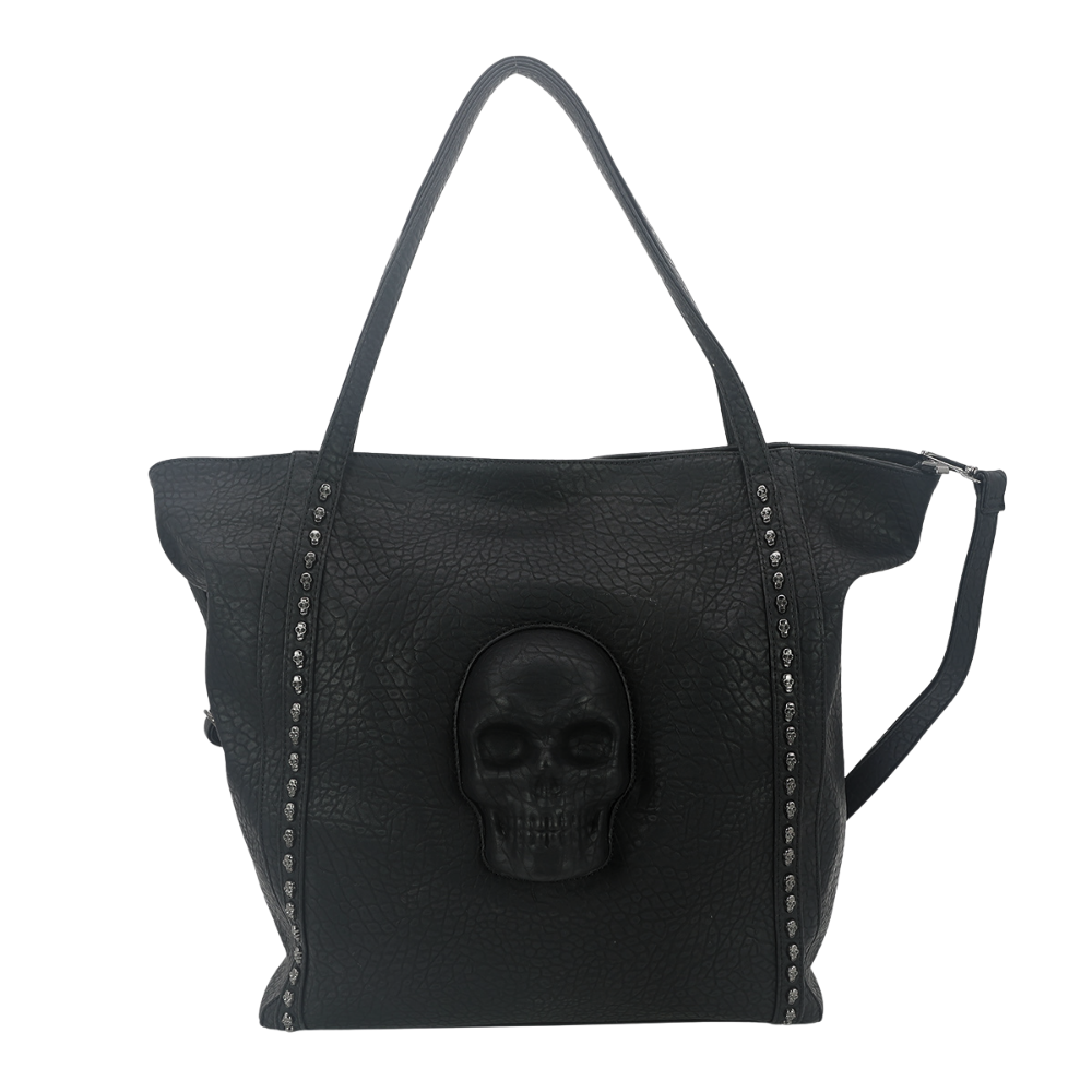 Turn heads with this bold Large Skull Tote, designed for customers who love statement-making, alternative fashion. Featuring a dramatic protruding skull centerpiece and vertical lines of metal skull studs cascading down from the handle base, this bag delivers strong visual impact with edgy detail.